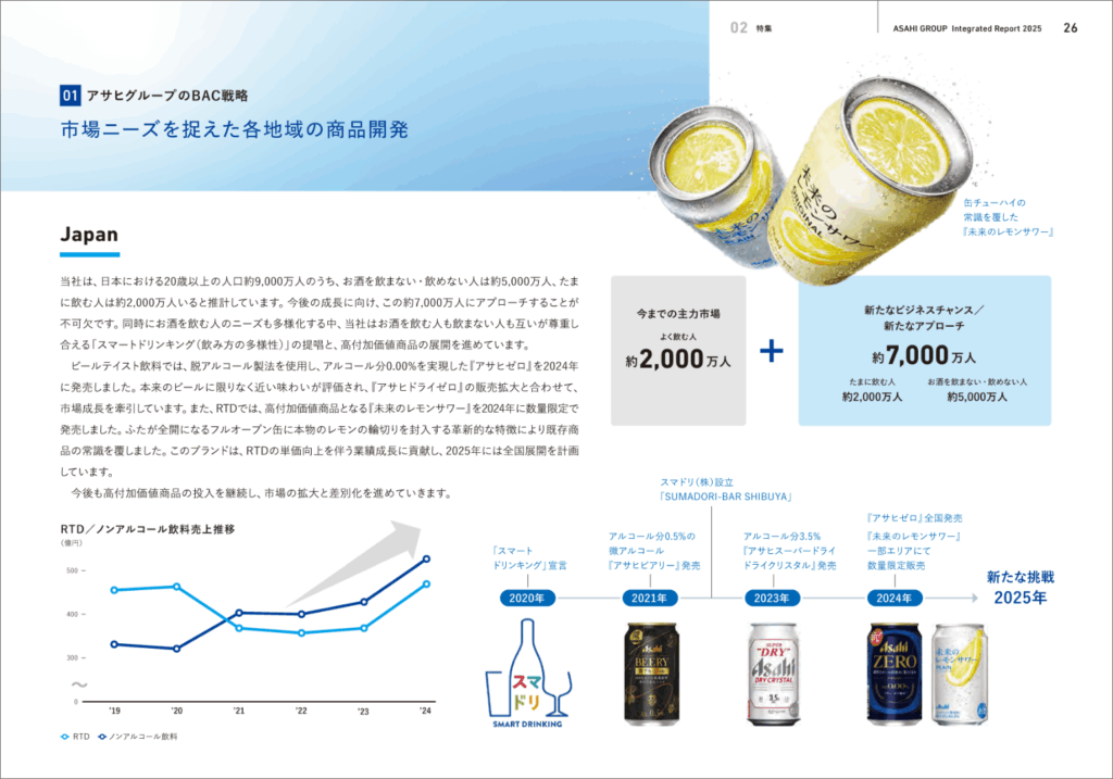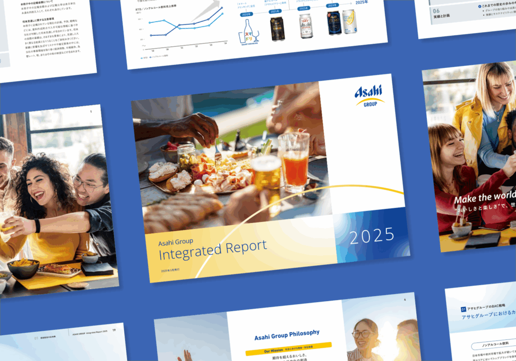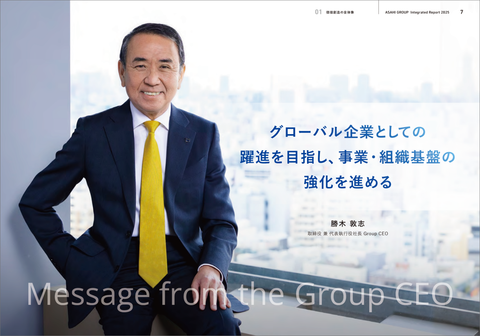 レポート冒頭には、前述の価値創造プロセスに加え、Group CEO・Group CFOメッセージを配置し、そして今後の成長の鍵となる「BAC(ノンアルコール飲料、RTD、成人向け清涼飲料などのビール隣接カテゴリー)戦略」と「AGPRO(グローバル調達会社)」を特集として取り上げました。これにより、冒頭で中長期戦略の全体像と2025年の重要ポイントを把握できる構成としました。