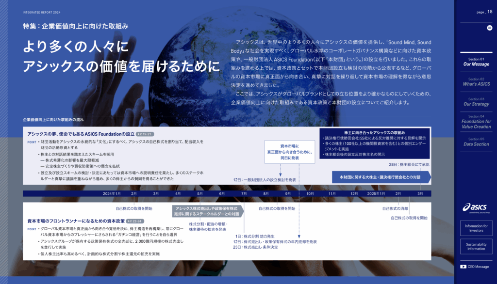 アシックス様は、目指す姿である「Sound Mind, Sound Body」な社会の実現に向けて、グローバル資本市場と真正面から向き合いながら企業価値向上に向けた取り組みを進めてきました。統合報告書2024では、特集として企業価値向上に向けた取り組みを取り上げ、一般財団法人ASICS Foundationの設立、グローバル水準のコーポレートガバナンスを追求した資本政策について説明しています。先進的な取り組みを時系列に沿って紹介することで、アシックス様がどのようにして経営の透明性や持続的成長を実現してきたのかを、読者に分かりやすく訴求しています。