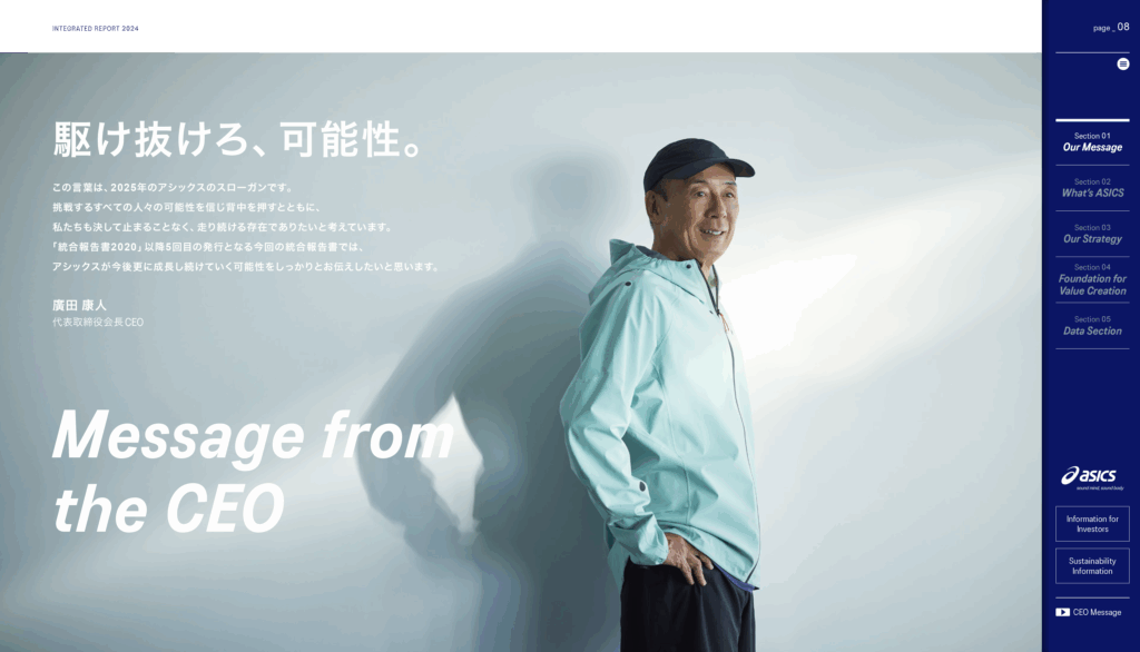 さらに、廣田CEOが統合報告書の見どころや制作に込めた想いを語る動画コンテンツへのリンクを掲載し、アシックス様の目指す未来が臨場感をもって理解できる内容となっています。