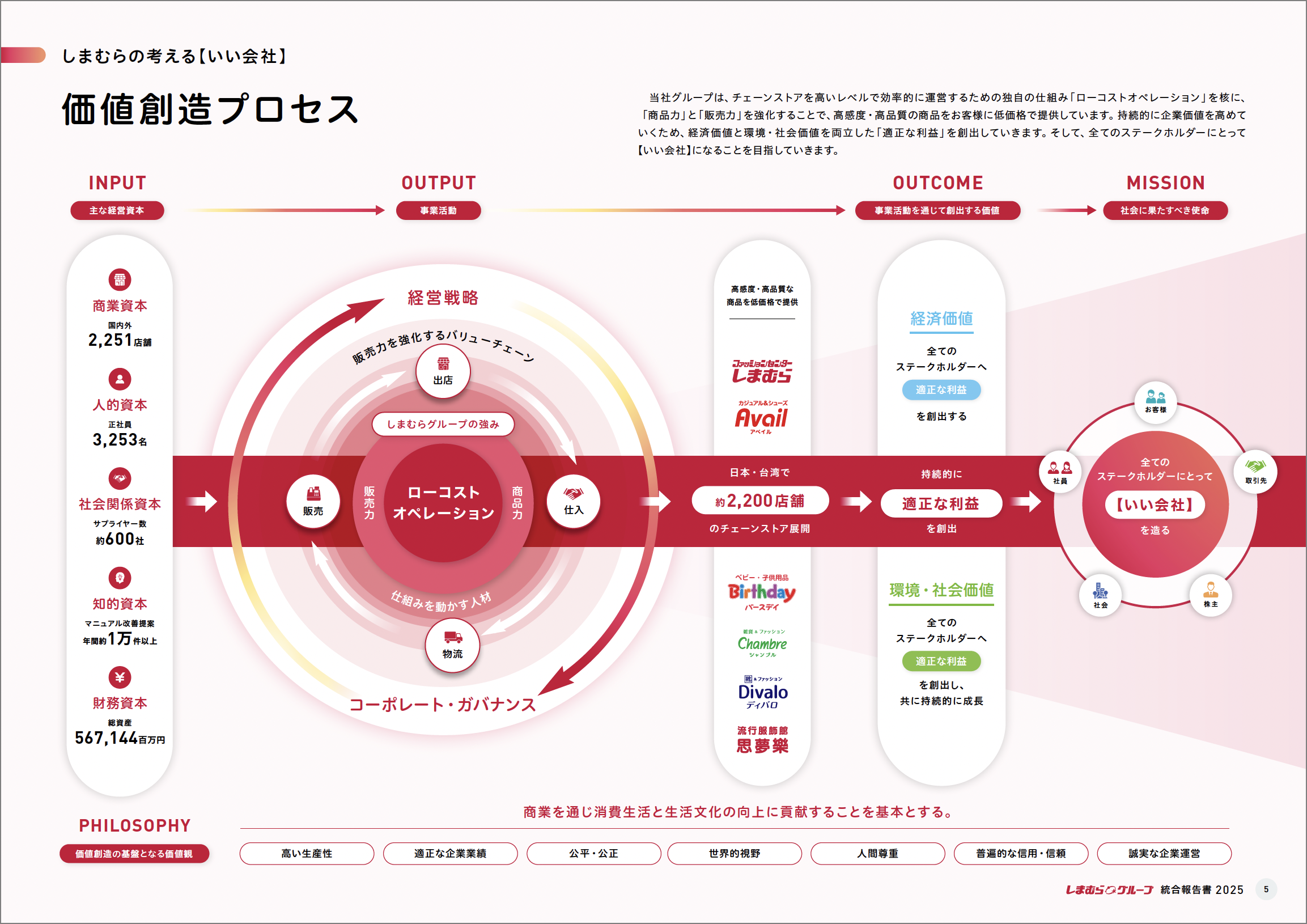 デザインを通しても「しまむら」らしさを体現できるよう、デザインのコンセプト設計を行い、やわらかく親しみやすい印象でありながら、洗練されたレポートを目指しました。社員様の撮影も当社がディレクションを担当しており、写真を通じて、社内の雰囲気がよく伝わるレポートとなりました。