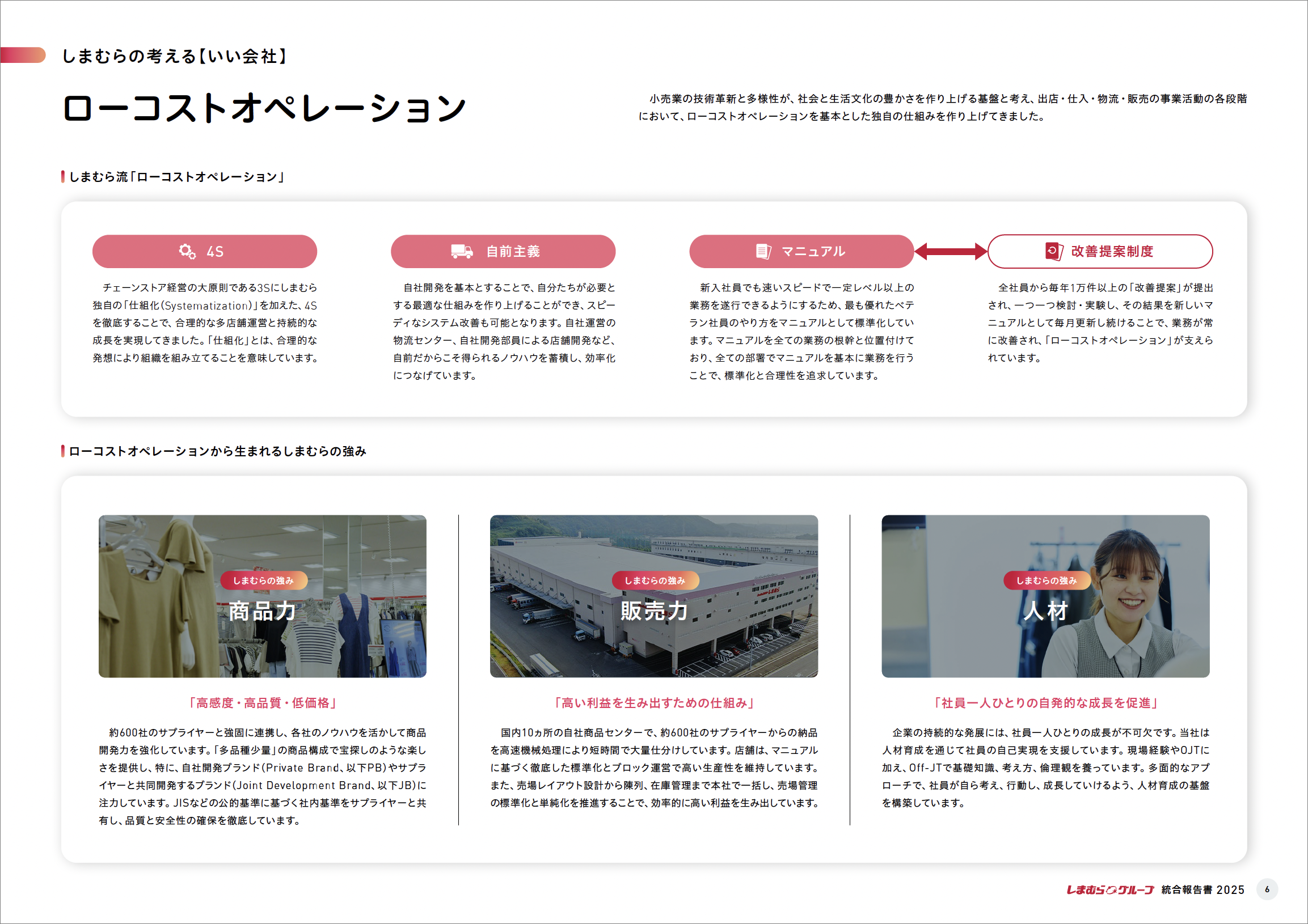 「しまむら」の強みである生産性や、効率性を伝える特集を掲載しました。PB(プライベートブランド)、JB(ジョイントディベロップメントブランド)や、インフルエンサーとの協業のほか、オンラインストア、ポップアップストアなどの販売手法について紹介し、収益性の高いビジネスを訴求しています。