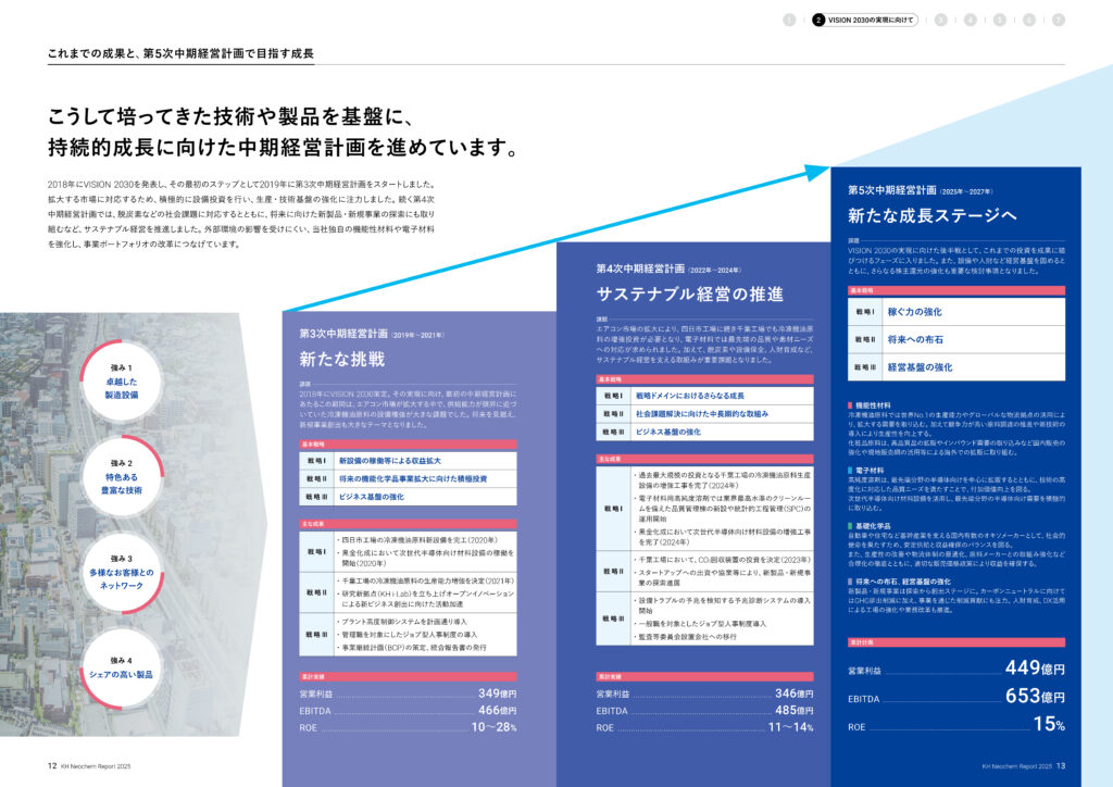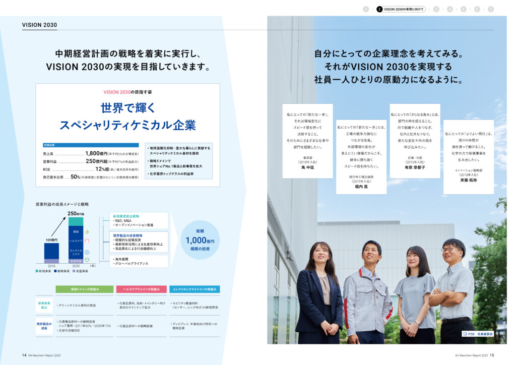 KHネオケムレポート2025では、この第5次中期経営計画の3年間が、VISION 2030の実現にどのようにつながっていくのかを中長期的な視点で丁寧に描き、「将来に向けた道筋」を分かりやすく示すことを目指しました。