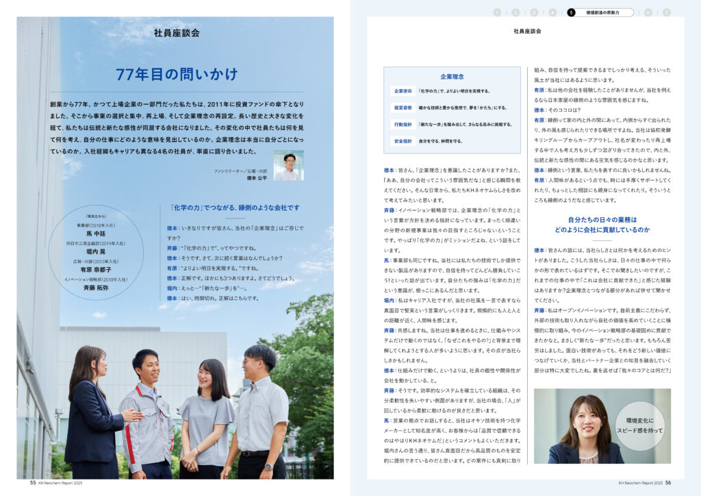 さらに、VISION 2030の実現を担うのは、そこで働く「人財」です。社員の声を引き出す座談会では、自身の業務と企業理念の関わりについて、社員が自らの言葉で議論し考えるというユニークな視点から、KHネオケム様の企業風土を紹介し、読者の共感を促しています。