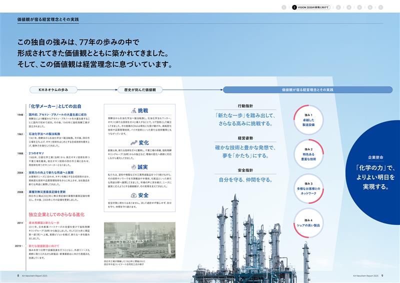 その一環として、レポートの序盤ではKHネオケム様のDNAにあたる「価値観」や「これまでに培ってきた強み」を起点として、成長ストーリーを明確に描きました。これにより、過去から現在までの取り組みや成果が、未来の持続的な成長へと確実に結びついていることを、読者に論理的かつ自然な流れで伝える構成としています。