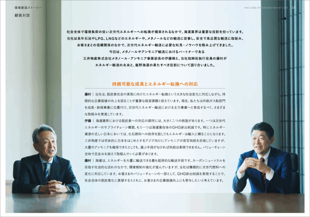 未来のエネルギー輸送はどうなるのか、その中で飯野海運株式会社様はどのような役割を担おうとしているのか。現在から未来にかけて、社会全体の脱炭素化や顧客企業の価値向上への貢献を目指す姿が具体的に伝わる特集を目指しました。