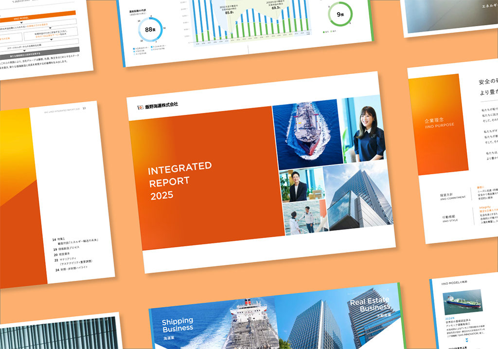 統合報告書2025では、海運業・不動産業の2つの事業を展開する独自のビジネスモデル「IINO MODEL」を視覚的に理解できるように表現した上で、独自のビジョンと提供価値、経営戦略を読者に明確に伝えるレポートづくりを意識しました。