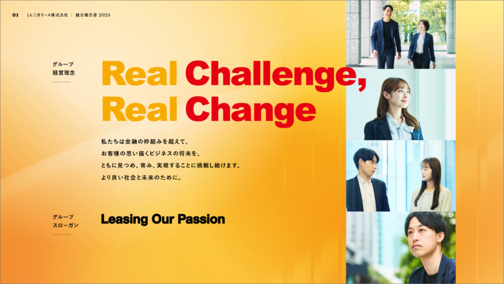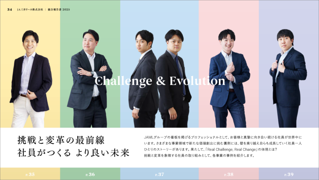 初発行となる「統合報告書2025」は、グループ経営理念「Real Challenge, Real Change」を軸に、経営層からのメッセージや組織づくりに関する情報など、社外のステークホルダーから社員一人ひとりまで、幅広い層に届く内容づくりを意識しています。