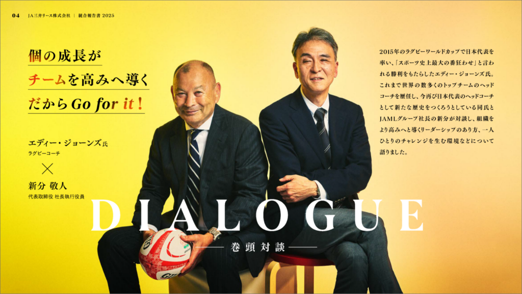 ラグビーコーチのエディー・ジョーンズ氏をゲストに迎え、新分社長との対談を実施しました。組織づくりやリーダーシップに対する社長の考え方や、ジョーンズ氏のプロフェッショナルな姿勢から得られる示唆に、読者が臨場感を持って共感できる構成としています。