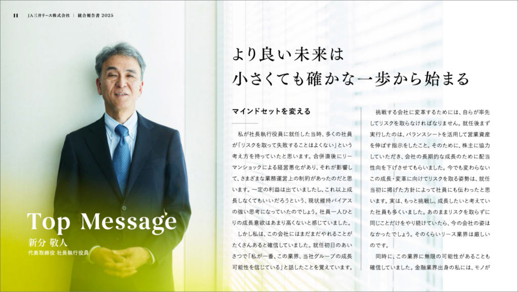 経営理念「Real Challenge, Real Change」を、なぜ今こそ体現する必要があるのか――その背景を、社長ご自身のこれまでの挑戦や変革を振り返りながら、語っていただきました。また、経営理念と長期ビジョン、中期経営計画の位置づけを示し、「より良い未来は小さくても確かな一歩から始まる」というタイトルメッセージに込められた想いが伝わるように構成を意識しています。