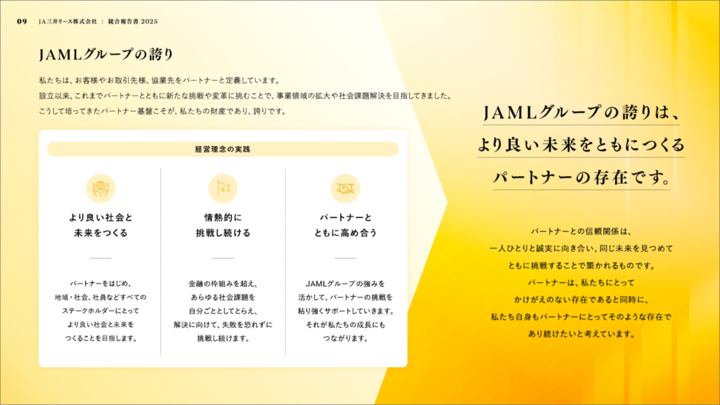 経営理念に基づく社員一人ひとりのアクションが、パートナーとの信頼関係を築き、相互成長を生み出す。その積み重ねがJA三井リース株式会社様の目指す「より良い社会と未来」の実現につながることをストーリーとして整理しています。