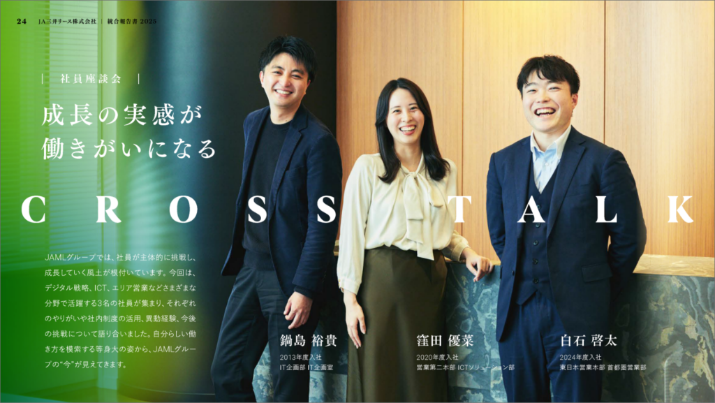 日々の業務で感じるやりがい、キャリア形成の考え方、挑戦したいことなど、社員のリアルな声を引き出すことで、社員目線での「JA三井リースらしさ」を伝える内容としています。