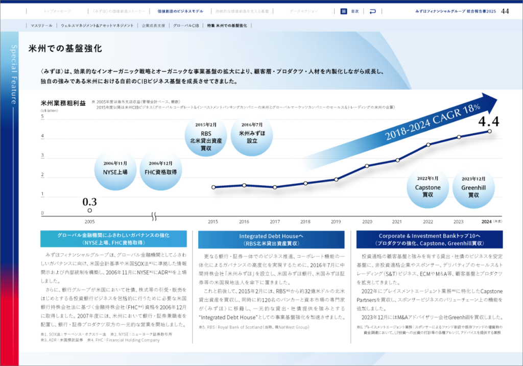また、価値創造のビジネスモデルにおける特集「米州での基盤強化」では、〈みずほ〉の独自の強みの一つである米州におけるCIB(コーポレート&インベストメントバンキング)ビジネス基盤について取り上げています。北米におけるインオーガニック戦略とオーガニックな事業基盤の拡大の歴史と〈みずほ〉がCIBビジネスでめざす方向性を紐解き、また米州ビジネスのManagement interview(P.46~48)も掲載することで、多面的に強みの源泉を解説しています。