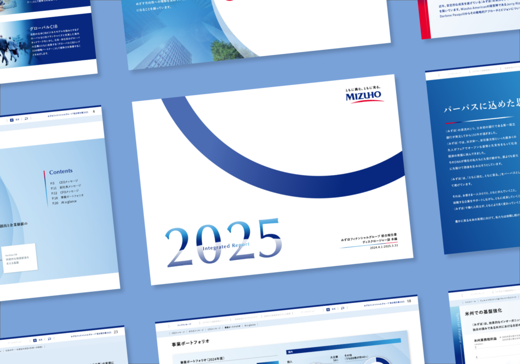 2025年版の統合報告書では更なる成長に向けた〈みずほ〉の「挑戦」や「変革」をより明確に打ち出すために必要な要素を抽出しました。〈みずほ〉の価値創造ストーリーでは〈ありたき世界〉までの道のりを1ページで図解し、実現に向けた資本や戦略、提供価値等を後続のページで解説する形式としています。1ページ当たりの情報量を精査し、ページごとの意図が一目で伝わるよう整理するとともに、提供価値までの道のりを自然な流れで理解できる構成としました。